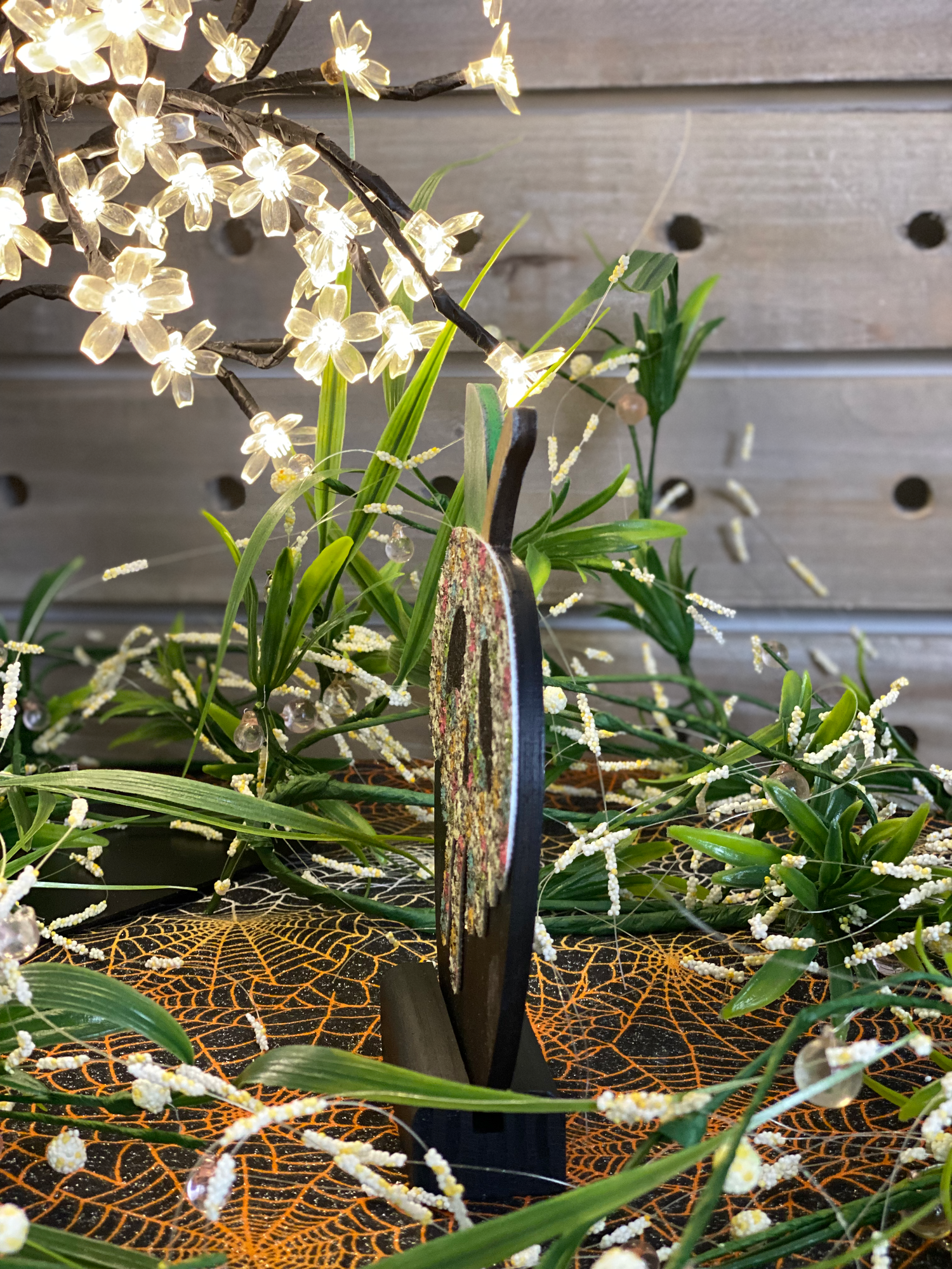 Meet Rip Poison Apple. He wears a glittered mask full of skulls to let you know he means business. On his back he shows off his name, speedy broomstick, and his cat. He’s going to add some fun and sparkle to your tiered tray, kitchen island, entry table, or any place that you want to show him off.